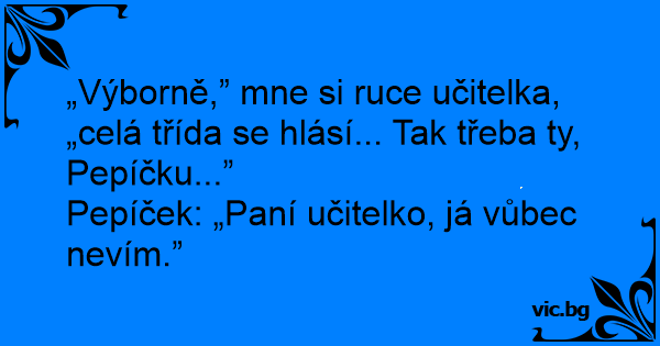 „Výborně,” mne si ruce učitelka, „celá třída se hlásí... Tak třeba ty, Pepíčku...”