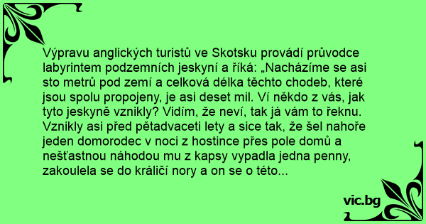 Výpravu anglických turistů ve Skotsku provádí průvodce labyrintem podzemních jeskyní a říká: „Nacházíme se asi sto metrů pod zemí a celková délka těchto chodeb, které jsou spolu propojeny, je asi deset mil. Ví někdo z vás, jak tyto jeskyně vznikly? Vidím, že neví, tak já vám to řeknu. Vznikly asi před pětadvaceti lety a sice tak, že šel nahoře jeden domorodec v noci z hostince přes pole domů a nešťastnou náhodou mu z kapsy vypadla jedna penny, zakoulela se do králičí nory a on se o této nešťastné příhodě zmínil před svými známými...”