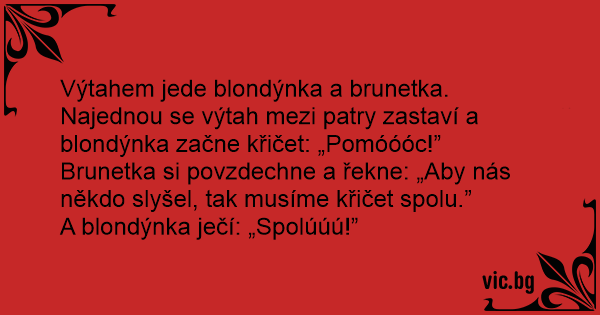 Výtahem jede blondýnka a brunetka. Najednou se výtah mezi patry zastaví a blondýnka začne křičet: „Pomóóóc!”