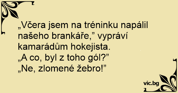 „Včera jsem na tréninku napálil našeho brankáře,” vypráví kamarádům hokejista.