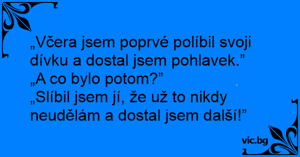 „Včera jsem poprvé políbil svoji dívku a dostal jsem pohlavek.”<br />„A co bylo potom?”<br />„Slíbil jsem jí, že už to nikdy neudělám a dostal jsem další!”