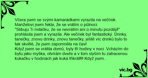 Včera jsem se svými kamarádkami vyrazila na večírek. Manželovi jsem řekla, že se vrátím o půlnoci.
