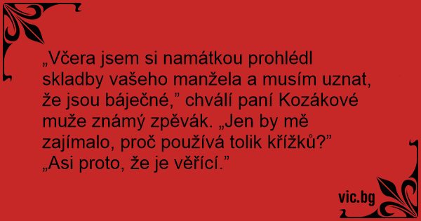 „Včera jsem si namátkou prohlédl skladby vašeho manžela a musím uznat, že jsou báječné,” chválí paní Kozákové muže známý zpěvák. „Jen by mě zajímalo, proč používá tolik křížků?”