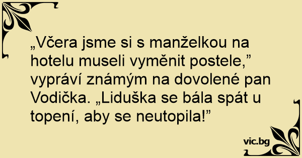 „Včera jsme si s manželkou na hotelu museli vyměnit postele,” vypráví známým na dovolené pan Vodička. „Liduška se bála spát u topení, aby se neutopila!”