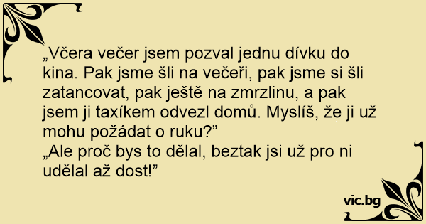 „Včera večer jsem pozval jednu dívku do kina. Pak jsme šli na večeři, pak jsme si šli zatancovat, pak ještě na zmrzlinu, a pak jsem ji taxíkem odvezl domů. Myslíš, že ji už mohu požádat o ruku?”
