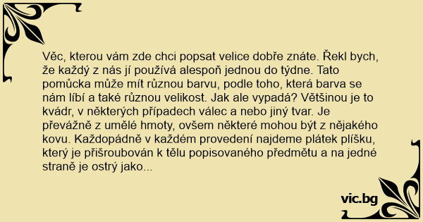 Věc, kterou vám zde chci popsat velice dobře znáte. Řekl bych, že každý z nás jí používá alespoň jednou do týdne. Tato pomůcka může mít různou barvu, podle toho, která barva se nám líbí a také různou velikost. Jak ale vypadá? Většinou je to kvádr, v některých případech válec a nebo jiný tvar. Je převážně z umělé hmoty, ovšem některé mohou být z nějakého kovu. Každopádně v každém provedení najdeme plátek plíšku, který je přišroubován k tělu popisovaného předmětu a na jedné straně je ostrý jako žiletka. Bez čeho by se pomůcka neobešla, je postranní otvor, který je téměř po celé délce věci a postupně se zužuje, až je docela nepatrný. Kdybych vám řekl, k čemu se používá, hned by bylo zřejmé o co jde. Snad jen řeknu, že by tento předmět neměl chybět v žádném, řádně vybaveném školním penále.