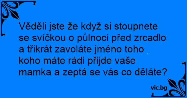 Věděli jste že když si stoupnete se svíčkou o půlnoci před zrcadlo a třikrát zavoláte jméno toho koho máte rádi přijde vaše mamka a zeptá se vás co děláte?