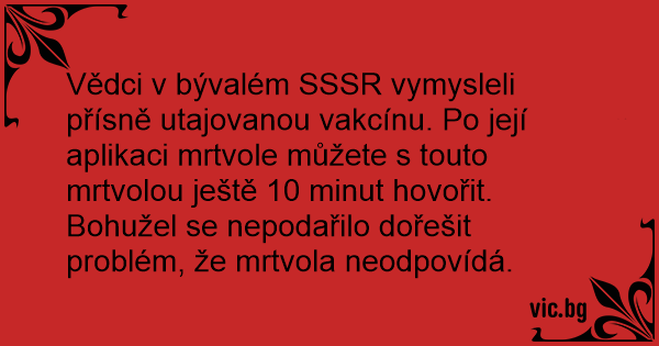 Vědci v bývalém SSSR vymysleli přísně utajovanou vakcínu. Po její aplikaci mrtvole můžete s touto mrtvolou ještě 10 minut hovořit. Bohužel se nepodařilo dořešit problém, že mrtvola neodpovídá.
