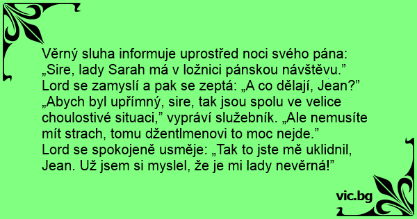 Věrný sluha informuje uprostřed noci svého pána: „Sire, lady Sarah má v ložnici pánskou návštěvu.”