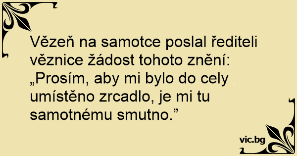 Vězeň na samotce poslal řediteli věznice žádost tohoto znění: „Prosím, aby mi bylo do cely umístěno zrcadlo, je mi tu samotnému smutno.”
