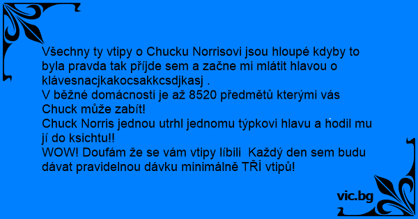 Všechny ty vtipy o Chucku Norrisovi jsou hloupé kdyby to byla pravda tak příjde sem a začne mi mlátit hlavou o klávesnacjkakocsakkcsdjkasj .