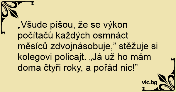 „Všude píšou, že se výkon počítačů každých osmnáct měsíců zdvojnásobuje,” stěžuje si kolegovi policajt. „Já už hо mám doma čtyři roky, a pořád nic!”