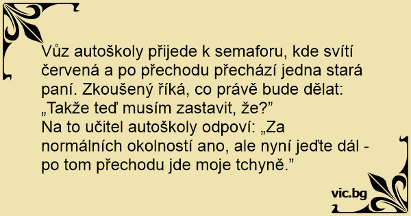 Na to učitel autoškoly odpoví: „Za normálních okolností ano, ale nyní jeďte dál - po tom přechodu jde moje tchyně.”