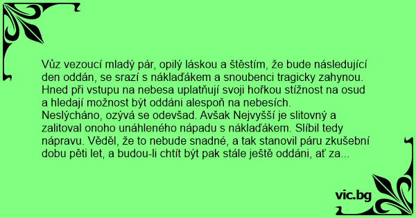 Neslýcháno, ozývá se odevšad. Avšak Nejvyšší je slitovný a zalitoval onoho unáhleného nápadu s náklaďákem. Slíbil tedy nápravu. Věděl, že to nebude snadné, a tak stanovil páru zkušební dobu pěti let, a budou-li chtít být pak stále ještě oddáni, ať za ním přijdou. Tak se také stalo. Nicméně Nejvyšší zcela nečekaně a bez vysvětlování prodloužil lhůtu o dalších pět let. Když však poté přišli, že chtějí být oddáni, byla vystrojena velká veselice a jejich přání bylo splněno.