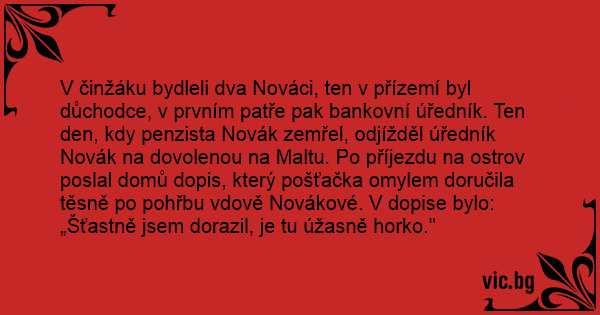 V činžáku bydleli dva Nováci, ten v přízemí byl důchodce, v prvním patře pak bankovní úředník. Ten den, kdy penzista Novák zemřel, odjížděl úředník Novák na dovolenou na Maltu. Po příjezdu na ostrov poslal domů dopis, který pošťačka omylem doručila těsně po pohřbu vdově Novákové. V dopise bylo: