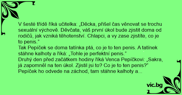 V šesté třídě říká učitelka: „Děcka, přišel čas věnovat se trochu sexuální výchově. Děvčata, váš první úkol bude zjistit doma od rodičů, jak vzniká těhotenství. Chlapci, a vy zase zjistíte, co je to реnis.”