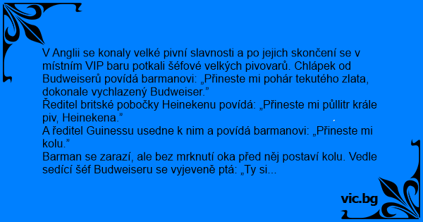 V Anglii se konaly velké pivní slavnosti a po jejich skončení se v místním VIP baru potkali šéfové velkých pivovarů. Chlápek od Budweiserů povídá barmanovi: „Přineste mi pohár tekutého zlata, dokonale vychlazený Budweiser.”
