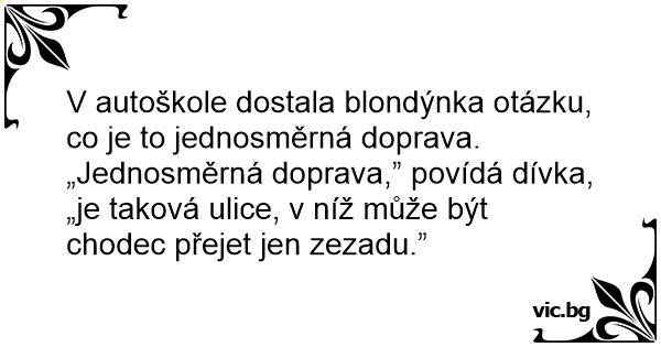 „Jednosměrná doprava,” povídá dívka, „je taková ulice, v níž může být chodec přejet jen zezadu.”