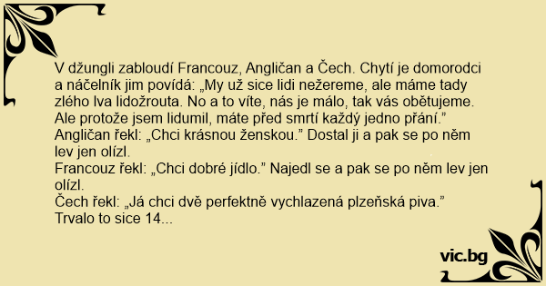V džungli zabloudí Francouz, Angličan a Čech. Chytí je domorodci a náčelník jim povídá: „My už sice lidi nežereme, ale máme tady zlého lva lidožrouta. No a to víte, nás je málo, tak vás obětujeme. Ale protože jsem lidumil, máte před smrtí každý jedno přání.”