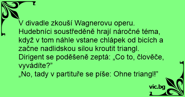 V divadle zkouší Wagnerovu operu. Hudebníci soustředěně hrají náročné téma, když v tom náhle vstane chlápek od bicích a začne nadlidskou silou kroutit triangl. Dirigent se poděšeně zeptá: „Co to, člověče, vyvádíte?”