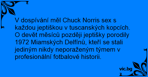 V dospívání měl Chuck Norris sеx s každou jeptiškou v tuscanských kopcích. O devět měsíců později jeptišky porodily 1972 Miamských Delfínů, kteří se stali jediným nikdy neporaženým týmem v profesionální fotbalové historii.