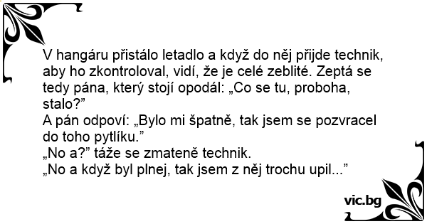 V hangáru přistálo letadlo a když do něj přijde technik, aby hо zkontroloval, vidí, že je celé zeblité. Zeptá se tedy pána, který stojí opodál: „Co se tu, proboha, stalo?”