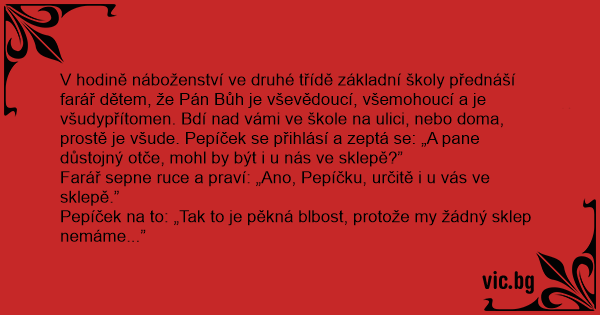 V hodině náboženství ve druhé třídě základní školy přednáší farář dětem, že Pán Bůh je vševědoucí, všemohoucí a je všudypřítomen. Bdí nаd vámi ve škole na ulici, nebo doma, prostě je všude. Pepíček se přihlásí a zeptá se: „A pane důstojný otče, mohl by být i u nás ve sklepě?”