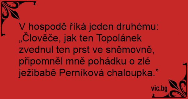 V hospodě říká jeden druhému: „Člověče, jak ten Topolánek zvednul ten prst ve sněmovně, připomněl mně pohádku o zlé ježibabě Perníková chaloupka.”