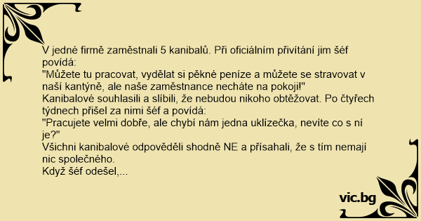 Kanibalové souhlasili a slíbili, že nebudou nikoho obtěžovat. Po čtyřech týdnech přišel za nimi šéf a povídá: