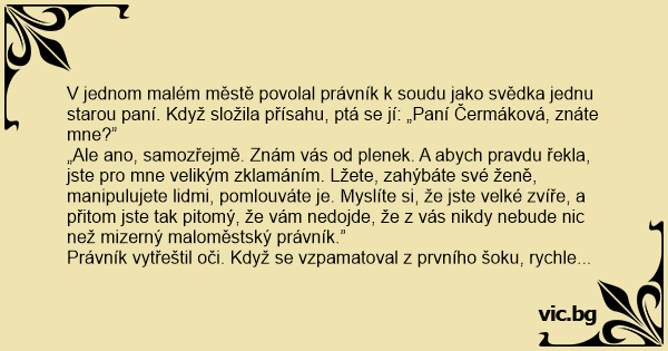 V jednom malém městě povolal právník k soudu jako svědka jednu starou paní. Když složila přísahu, ptá se jí: „Paní Čermáková, znáte mne?”