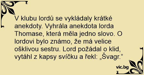 V klubu lordů se vykládaly krátké anekdoty. Vyhrála anekdota lorda Thomase, která měla jedno slovo. O lordovi bylo známo, že má velice ošklivou sestru. Lord požádal o klid, vytáhl z kapsy svíčku a řekl: „Švagr.”