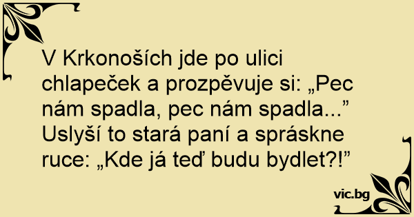 V Krkonoších jde po ulici chlapeček a prozpěvuje si: „Pec nám spadla, pec nám spadla...”