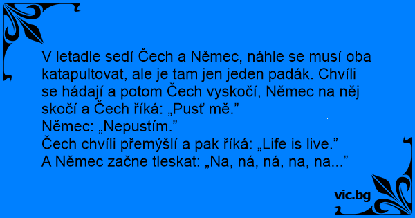 V letadle sedí Čech a Němec, náhle se musí oba katapultovat, ale je tam jen jeden padák. Chvíli se hádají a potom Čech vyskočí, Němec na něj skočí a Čech říká: „Pusť mě.”