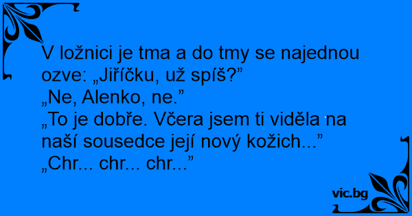 V ložnici je tma a do tmy se najednou ozve: „Jiříčku, už spíš?”