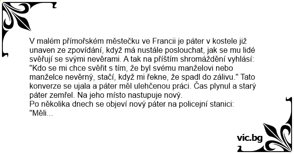 "Kdo se mi chce svěřit s tím, že byl svému manželovi nebo manželce nevěrný, stačí, když mi řekne, že spadl do zálivu." Tato konverze se ujala a páter měl ulehčenou práci. Čas plynul a starý páter zemřel. Na jeho místo nastupuje nový.