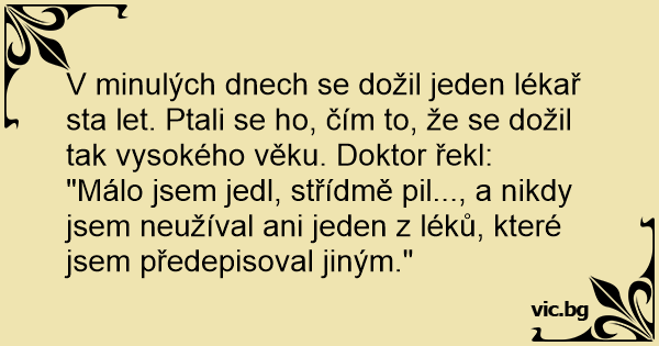 V minulých dnech se dožil jeden lékař sta let. Ptali se hо, čím to, že se dožil tak vysokého věku. Doktor řekl: