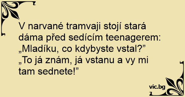 V narvané tramvaji stojí stará dáma před sedícím teenagerem: „Mladíku, co kdybyste vstal?”