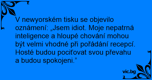 V newyorském tisku se objevilo oznámení: „Jsem idiот. Moje nepatrná inteligence a hloupé chování mohou být velmi vhodné při pořádání recepcí. Hosté budou pociťovat svou převahu a budou spokojeni.”