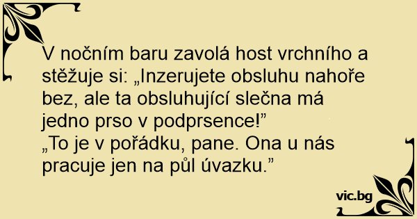 V nočním baru zavolá host vrchního a stěžuje si: „Inzerujete obsluhu nahoře bez, ale ta obsluhující slečna má jedno prso v podprsence!”