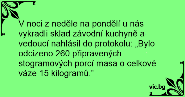 V noci z neděle na pondělí u nás vykradli sklad závodní kuchyně a vedoucí nahlásil do protokolu: „Bylo odcizeno 260 připravených stogramových porcí masa o celkové váze 15 kilogramů.”