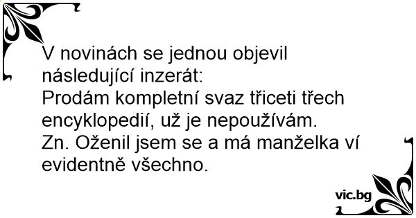 Inzerát: "Prodám všeobecnou encyklopedii, 45 dílů. Již ji nepotřebuji, před dvěma měsíci jsem se oženil. Moje tchyně ví naprosto všechno!"