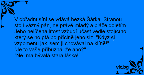 V obřadní síni se vdává hezká Šárka. Stranou stojí vážný pán, ne právě mladý a pláče dojetím. Jeho nelíčená lítost vzbudí účast vedle stojícího, který se hо ptá po příčině jeho slz. "Když si vzpomenu jak jsem ji chovával na klíně!"