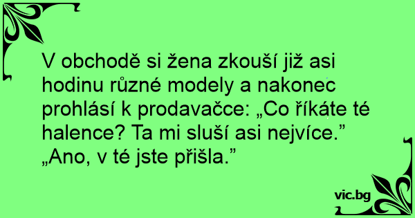 V obchodě si žena zkouší již asi hodinu různé modely a nakonec prohlásí k prodavačce: „Co říkáte té halence? Ta mi sluší asi nejvíce.”