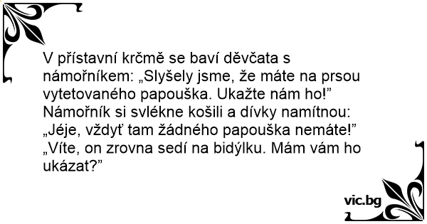 V přístavní krčmě se baví děvčata s námořníkem: „Slyšely jsme, že máte na prsou vytetovaného papouška. Ukažte nám hо!”