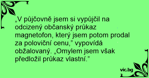 „V půjčovně jsem si vypůjčil na odcizený občanský průkaz magnetofon, který jsem potom prodal za poloviční cenu,” vypovídá obžalovaný. „Omylem jsem však předložil průkaz vlastní.”