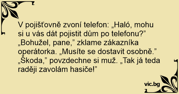 „Škoda,” povzdechne si muž. „Tak já teda raději zavolám hasiče!”