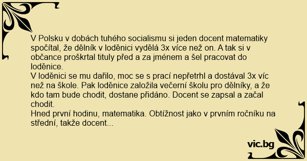 V Polsku v dobách tuhého socialismu si jeden docent matematiky spočítal, že dělník v loděnici vydělá 3x více než on. A tak si v občance proškrtal tituly před a za jménem a šel pracovat do loděnice.