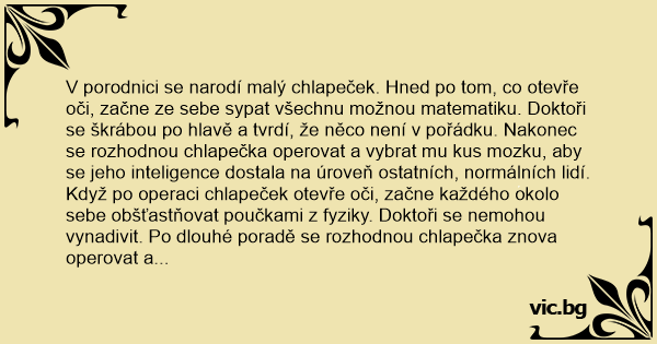 V porodnici se narodí malý chlapeček. Hned po tom, co otevře oči, začne ze sebe sypat všechnu možnou matematiku. Doktoři se škrábou po hlavě a tvrdí, že něco není v pořádku. Nakonec se rozhodnou chlapečka operovat a vybrat mu kus mozku, aby se jeho inteligence dostala na úroveň ostatních, normálních lidí.