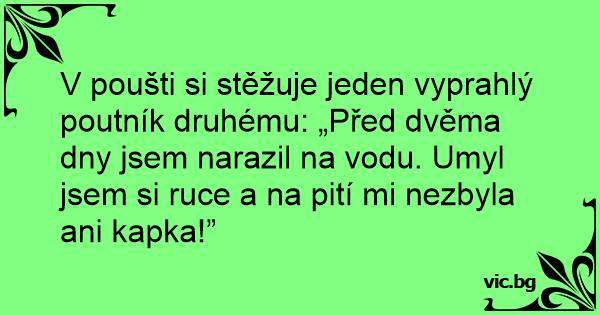 V poušti si stěžuje jeden vyprahlý poutník druhému: „Před dvěma dny jsem narazil na vodu. Umyl jsem si ruce a na pití mi nezbyla ani kapka!”