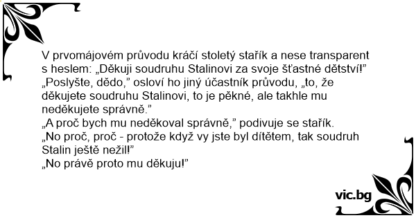 V prvomájovém průvodu kráčí stoletý stařík a nese transparent s heslem: „Děkuji soudruhu Stalinovi za svoje šťastné dětství!”